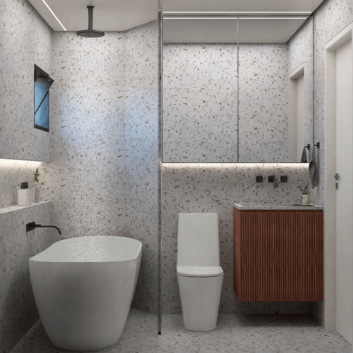 O resultado é uma superfície contínua, resistente ao desgaste e às intempéries, com estética moderna e manutenção simplificada — ideal para fachadas, halls de entrada e ambientes de alto tráfego.